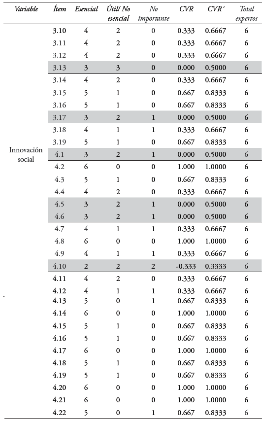 Por último, para la variable innovación social se presenta la Tabla 5, donde según la valoración nueve ítems presentan una razón de validez con un valor menor al deseable, los cuales se encuentran señalizados con un sombreado gris, mientras que, en contraparte, siete ítems presentan el valor más deseable otorgado por los expertos.