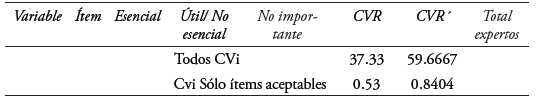 Una vez valorizados todos los ítems se determinó la razón de validez de contenido (CVR y CVR’) para cada uno de los ítems (Figura 3), es pertinente describir que bajo este modelo los ítems se consideran aceptables cuando su CVR’ es igual o mayor a 0.58. El cálculo de dicho índice fue realizado con apoyo del programa Microsoft Excel 2013.