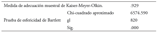 Según López et al. (2017) la prueba de esfericidad de Bartlett contrasta la hipótesis nula de que la matriz de correlaciones observada es en realidad una matriz de identidad. Al observar los resultados de la Tabla 7 se puede inferir que la matriz de datos es válida para continuar con el proceso de análisis factorial, dado que el nivel de significancia de 0.000 es menor que 0.05 (Sig<0.05). Asimismo, el valor del índice Kaiser-Meyer-Olkin (KMO) de 0.929 indica que la muestra es apropiada y por lo tanto se puede continuar con la aplicación del análisis factorial (Véliz-Capuñay, 2017).