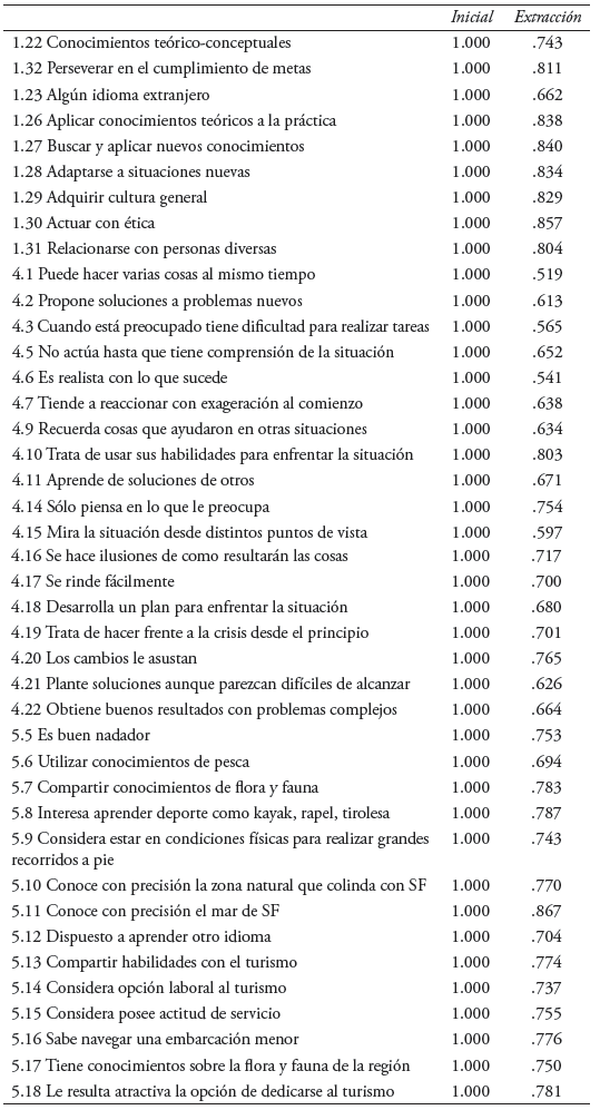Con el fin de establecer si el instrumento mide y representa el constructo de la competitividad turística, se realizó el análisis factorial exploratorio, se calculó el índice de Kaiser-Meyer-Olkin (KMO) y esfericidad de Bartlett, se interpretan las comunalidades, el gráfico de sedimentación, la varianza explicada y matriz de componentes. Se aplicó el método de extracción a través de la matriz de componentes principales y el de rotación Varimax (Tabla 2).