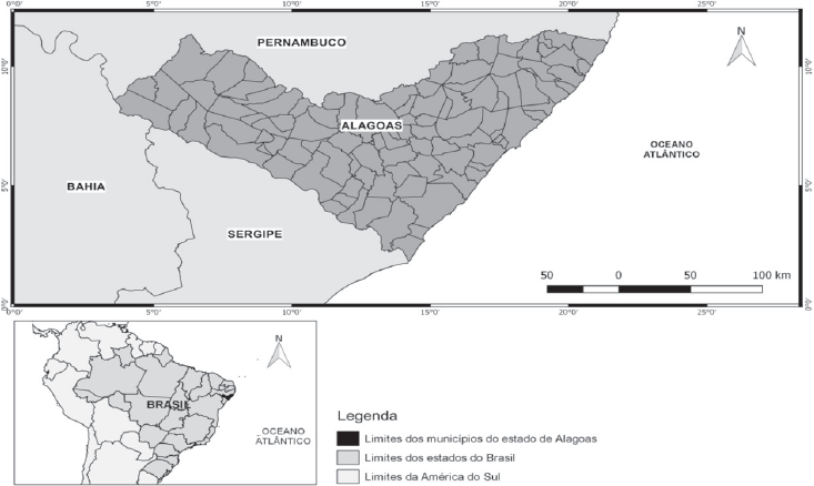 Antes de apresentar os resultados da análise descritiva e dos índices de autocorrelação espacial, faz-se necessário realizar uma breve contextualização da região em questão. O Estado de Alagoas está localizado na região Nordeste do Brasil e ocupa uma área de 27.933 km2, que representa 0,32% do território nacional. O referido Estado possui 102 municípios subdivididos em 13 microrregiões e 3 mesorregiões (Leste, Agreste e Sertão) e limita-se ao norte com o Estado de Pernambuco, a leste com o Oceano Atlântico, ao sul com o Estado de Sergipe e a oeste com o Estado da Bahia, conforme Figura 1.
