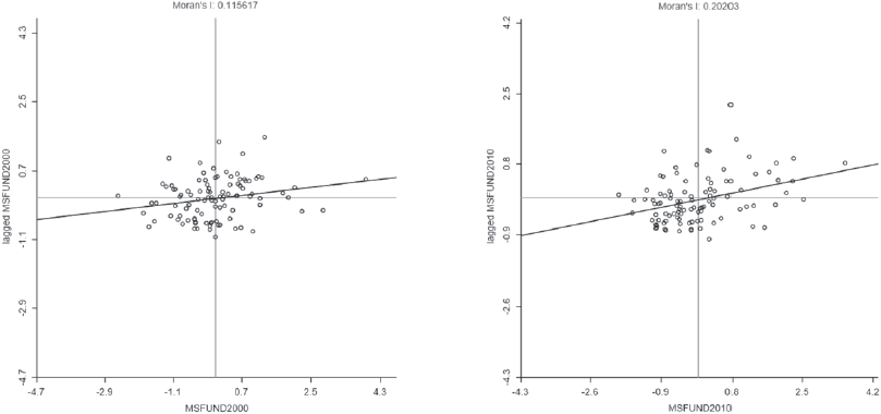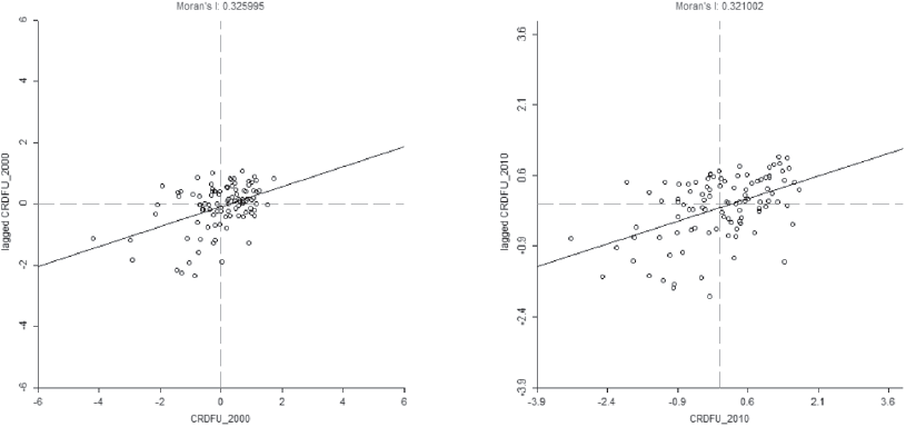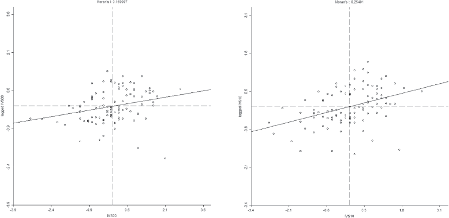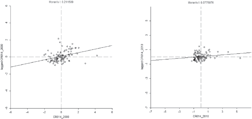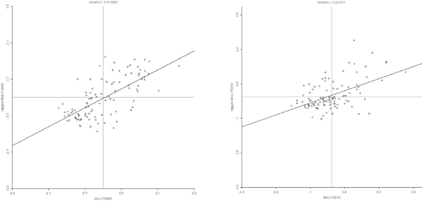 O primeiro dos testes realizados no presente estudo é o diagrama de dispersão do I de Moran global, para os anos de 2000 e 2010, conforme a Figura 2. O resultado do I de Moran global, para o ano de 2000, foi igual a 0.169997 e 0.25401, para o ano de 2010, em que ambos possuem um p-valor menor 0.05. Portanto, rejeita-se a hipótese nula de que a distribuição da vulnerabilidade social nos municípios alagoanos segue uma distribuição aleatória. Consequentemente, o estudo da influência espacial da vulnerabilidade social é pertinente. Desta forma, os resultados positivos e estatisticamente significantes do referido teste indica que um município com alto índice de vulnerabilidade social está circundado por municípios com características similares, o mesmo ocorrendo com municípios com valores baixos desse índice, que são cercados por municípios em situações similares, e que esta autocorrelação espacial aumentou entres os anos analisados.
