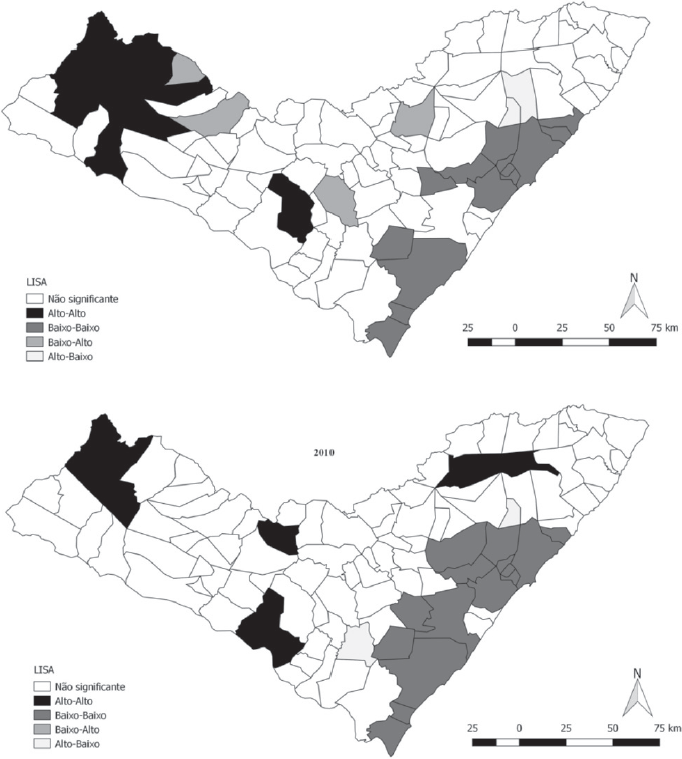 Portanto, a partir dos resultados gerados pela estatística LISA, pode-se determinar quatro padrões de autocorrelação espacial, os quais indicam a formação de aglomerações. Estes padrões são definidos como Alto-Alto (AA) e Baixo-Baixo (BB) que apontam as regiões que apresentam uma associação espacial homogênea, isto é, regiões com valores altos/baixos da variável de interesse pertencente a uma vizinhança com valores também altos (baixos). Já os padrões Alto-Baixo (AB) e Baixo-Alto (BA) indicam padrões heterogêneos de associação espacial, isto é, localidades com valores altos/baixos da variável em análise localizados numa vizinhança com valores baixos (altos).