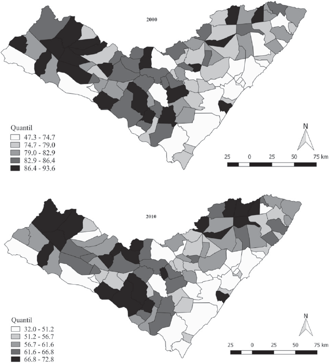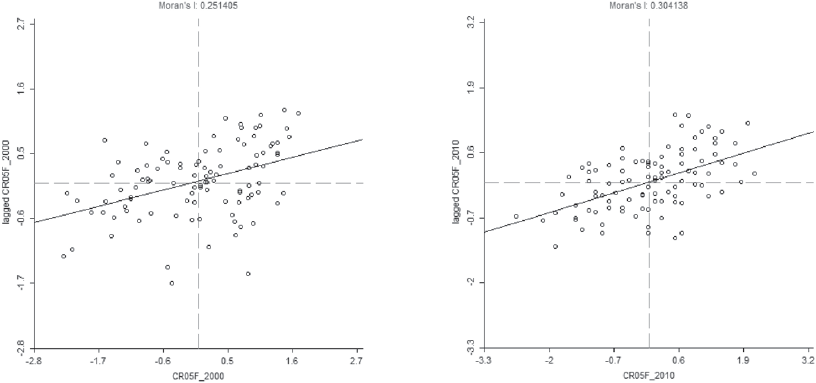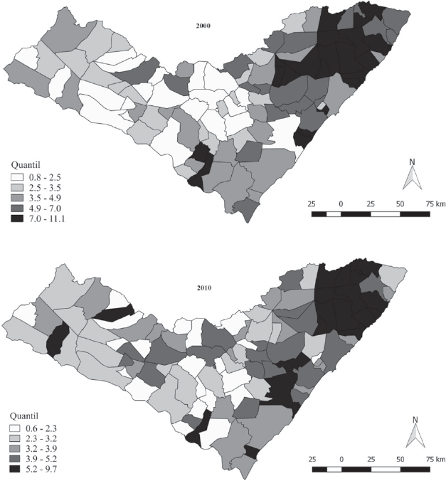 A Figura 5 mostra autocorrelação global positiva em 2000 e 2010, ou seja, em média, os municípios com maior porcentagem de mães entre 10 e 17 anos que tiveram filhos são circundados por municípios na mesma situação, enquanto que os municípios com menor porcentagem dessa variável são vizinhos de municípios na mesma circunstância, situação comprovada pela inclinação positiva da reta.