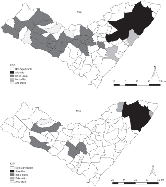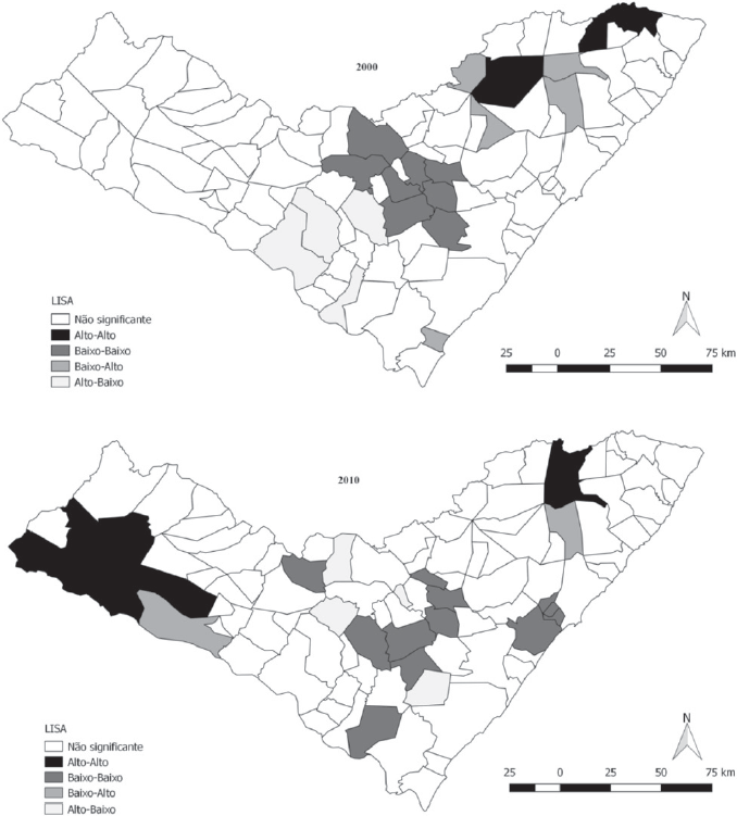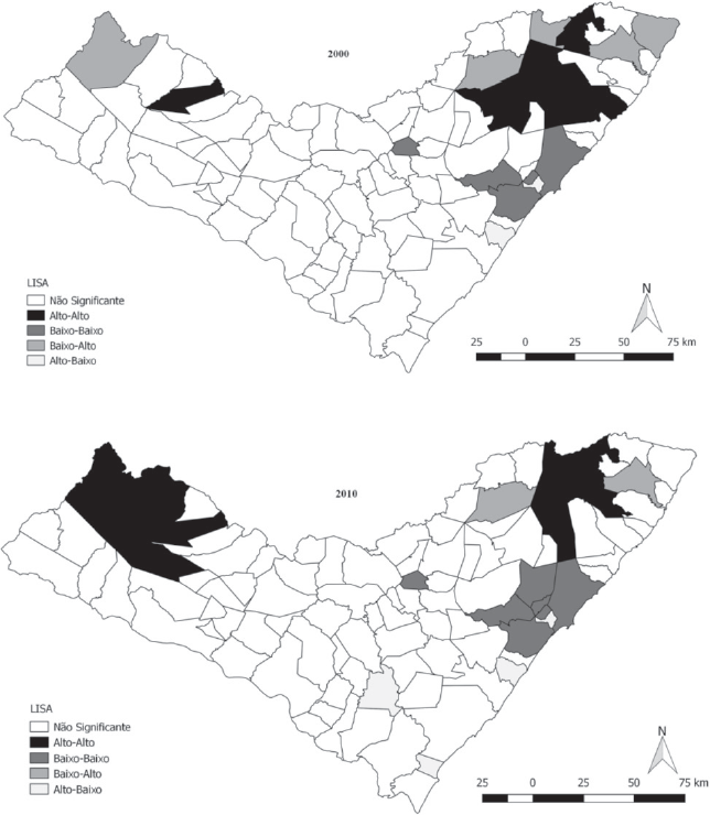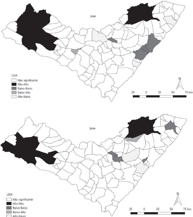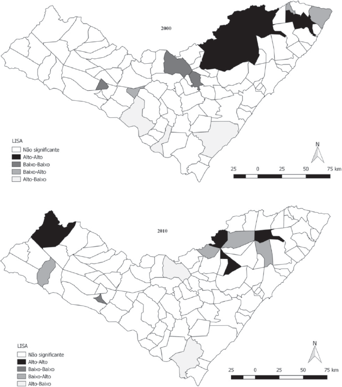 De acordo com a Figura 3, por meio do LISA, observa-se que, para o ano de 2000, há uma maior concentração de municípios no agrupamento Alto-Alto, localizados, predominantemente, na mesorregião do Leste alagoano. Ainda para o mesmo ano, os municípios que se encontravam na aglomeração do tipo Baixo-Baixo, também estavam, basicamente, concentrados na mesma mesorregião, sugerindo uma heterogeneidade dessa variável dentro da própria mesorregião Leste. Verifica-se que, após quase uma década, houve um espalhamento entre os municípios que formavam aglomeração do tipo Alto-Alto, concentrando-se entre as mesorregiões Sertão e Leste alagoano. Enquanto, que os municípios pertencentes ao agrupamento Baixo-Baixo continuaram distribuídos basicamente na mesorregião Leste.