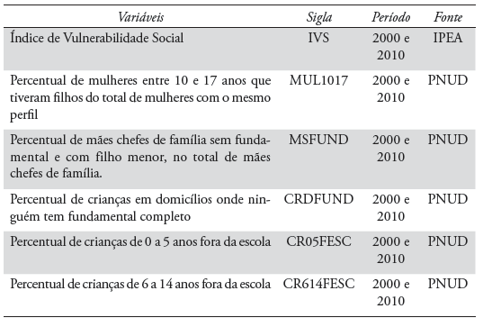 Para a construção dos indicadores foi utilizada uma matriz de contiguidade do tipo “rainha” que considera além das fronteiras com extensão maior que zero, os vértices de outras áreas que encontram com a área em estudo e passam a ser consideradas como contíguas. Vale ressaltar que os testes formais de associação espacial I de Moran global e o LISA foram realizados por meio de software GeoDa 1.12, desenvolvido por Anselin et al. (2006), enquanto, para a construção dos mapas, utilizou-se o software QGIS 2.18, desenvolvido pela Open Source Geospatial Foundation-OSGeo (2018). Foram utilizados dados fornecidos pelo PNUD a partir da base de dados do Censo Demográfico Brasileiro de 2000 e 2010 fornecidos pelo IBGE e do Instituto de Pesquisa Econômica Aplicada (IPEA). Apresenta-se a seguir um resumo das variáveis selecionadas para este estudo, de acordo com o Quadro 1.