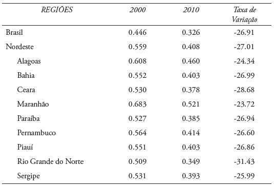 A Tabela 1 apresenta o comportamento do índice de vulnerabilidade social para o Brasil, região Nordeste e os estados pertencentes à referida região, em 2000 e 2010. Verifica-se que houve uma redução deste índice tanto para o Brasil, quanto para o Nordeste e em todos os estados nordestinos. Observa-se também que os Estados com as menores reduções, foram o Maranhão e Alagoas, justamente, aqueles mesmos que possuíam, em 2010, os índices mais elevados de vulnerabilidade social.