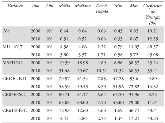 A seguir, apresenta-se a estatística descritiva do índice de vulnerabilidade social para os municípios alagoanos, bem como os seus respectivos indicadores associados à vulnerabilidade para mulheres e crianças, no período de 2000 e 2010. Verifica-se que, com exceção do percentual de mães chefes de família sem fundamental que apresentou um aumento da sua taxa média, todas as outras variáveis apresentaram uma redução nessa estatística. Conforme, o coeficiente de variação, observa-se que há uma grande dispersão das observações nas variáveis analisadas, exceto para o índice de vulnerabilidade social, percentual de crianças em domicílios onde ninguém tem fundamental completo e de crianças de 0 a 5 anos fora da escola. Apesar da grande dispersão entre as observações para algumas variáveis, as suas médias não ficaram muito distante de suas respectivas medianas.