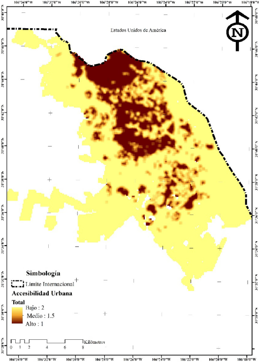 La accesibilidad existente en Ciudad Juárez, según lo arrojado por el modelo espacial de justicia socio-territorial generado a través de la metodología expuesta, se tradujo en áreas de color oscuro que cumplen con los criterios expuestos en la Tabla 2, por tanto, se definieron como aquellas con un mayor nivel de accesibilidad. Las que se distinguen en color claro se ubican en un nivel bajo, al presentar una combinación insuficiente según la ponderación asignada, por lo que se concluye que tienen carencias en el equipamiento necesario para la realización de las actividades cotidianas (Mapa 2).