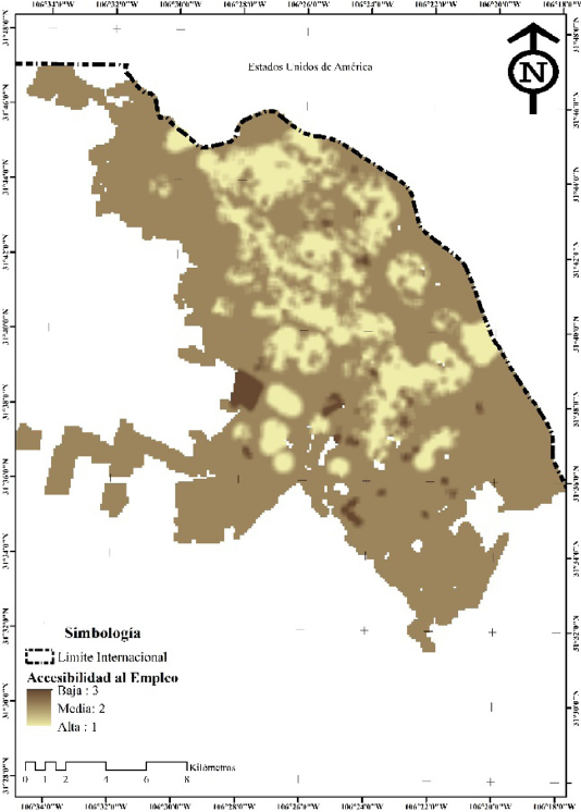 Analizar la ubicación de las principales fuentes de empleo y del equipamiento público, así como sus radios de influencia, permite determinar las carencias que posee la población que habita Ciudad Juárez en términos de su desarrollo social. En este caso se observa falta de justicia socio-territorial (equidad socioespacial) en el establecimiento de los servicios públicos en la ciudad, pues, aunque a más de 40% de la población se le ha ubicado formalmente en la zona del suroriente de la ciudad desde 1989, la dotación del equipamiento no ha ido desarrollándose al paso del tiempo en proporción a los pobladores.
