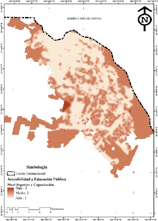 La centralización de la educación se vuelve más marcada en los niveles comprendidos en esta categoría, pues la mayor cantidad de espacios para capacitación técnica y educación superior se encuentran ubicados en la zona norte de la ciudad, principalmente en el casco histórico y cercanos al límite internacional. Esto pese a que la población se ha distribuido hacia otras zonas de la ciudad con apoyo de los programas de vivienda. Por lo que la mayor parte de los usuarios de estos centros educativos no habita en torno a ellos (Mapa 5).