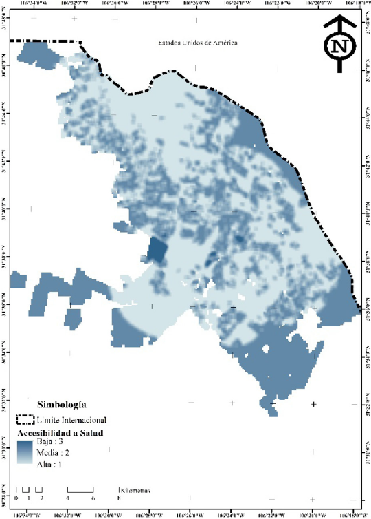 Respecto a la categoría de salud se identificaron los hospitales que dan servicio público y las unidades médicas familiares del IMSS. El valor asignado fue el mismo para ambos, pues, pese a que más de 70% de la población derechohabiente de Ciudad Juárez está afiliada al IMSS, también se consideró que este instituto es el que más unidades de atención tiene en la ciudad, lo que elevó el valor de los hospitales que dan atención no sólo a los derechohabientes sino al resto de la población.