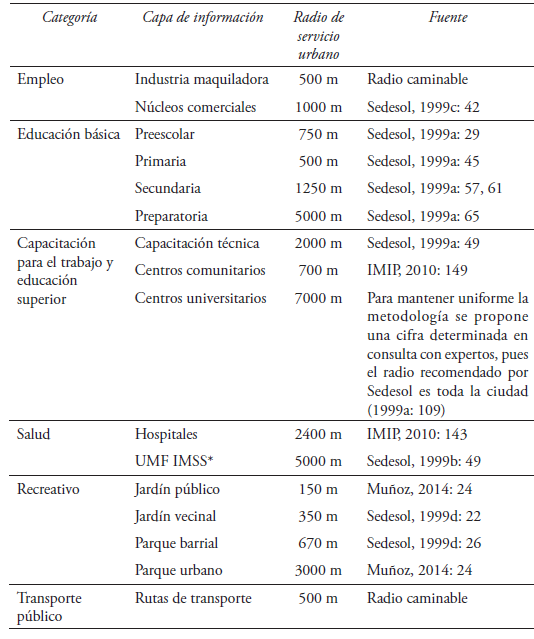 Con el Manual del Sistema normativo de equipamiento urbano de la Secretaría de Desarrollo Social (Sedesol), estudios contenidos en el Plan de Desarrollo Urbano 2010 del IMIP, la tesis de Muñoz (2014) y los comentarios de expertos en la materia como referencia, se estableció el radio de servicio urbano recomendable del equipamiento público; para los radios de servicio de las rutas de transporte público y las industrias maquiladoras se consideró una distancia máxima caminable de 500 metros, las distancias se señalan en la Tabla 1.