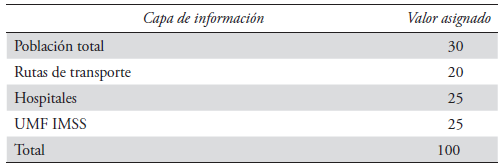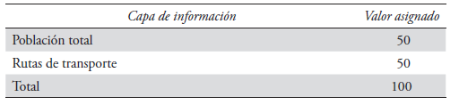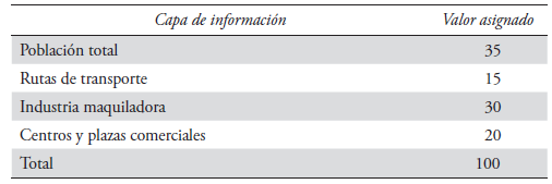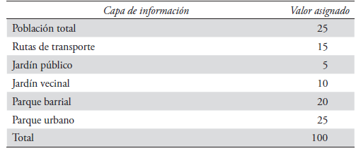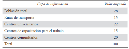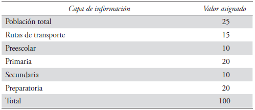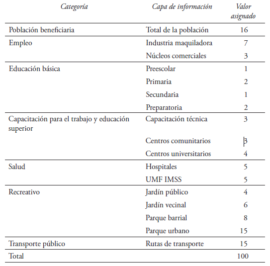 El criterio para la ponderación fue el establecimiento de una escala ascendente donde el valor máximo asignado fue 16 y el mínimo 1; se partió de que la cantidad y la ubicación de la población son de los elementos establecidos más importantes del análisis, pues se desea que los servicios públicos lleguen a la mayor cantidad posible de personas, se decidió que la población tendría el valor máximo. Posteriormente, de acuerdo al porcentaje aproximado de población económicamente activa que labora en los sectores indicados, se distribuyeron 10 puntos en la categoría de empleo.