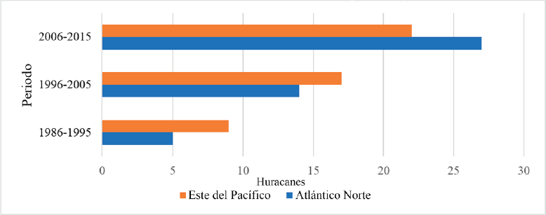 En la Gráfica 1 se observa que en el Atlántico norte -en un periodo de 30 años (de 1986 a 2015)- se ha registrado un aumento mayor a 500% en la presencia de huracanes (de 5 a 27 huracanes), y en el este del Pacífico, durante el mismo periodo, el registro demuestra que se ha superado por más del doble (de 9 a 22 huracanes). Ambas áreas oceánicas coinciden con costas del territorio mexicano. Los efectos del CC, como el incremento en la intensidad en los CT (ONU, 2015), golpean con mayor severidad a los países en desarrollo, pero sobre todo a las comunidades asentadas en zonas de riesgo (González-Gaudiano, 2007). En el estado de Veracruz estos fenómenos ya afectan a diversas regiones.