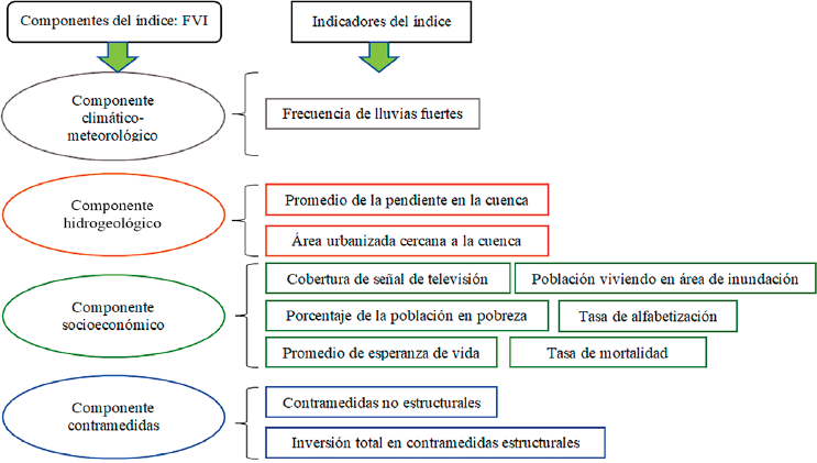 Son cuatro las categorías que consideran Balica et al. (2009) para el análisis de la vulnerabilidad: social, económica, física y ambiental. Las variables de cada una de las categorías de la vulnerabilidad ante inundaciones difieren de acuerdo con el lugar y el objetivo del estudio; no obstante, siempre deben comprender y considerar las características: ambientales, físicas, económicas, administrativas, sociales e institucionales. El estudio se realizó en Mannheim (Alemania), Phnom Penh (Camboya) y Timisoara (Rumanía), y en los ríos: Danubio, Tisza, Bega y Timisoara. Balica et al. (2009) tuvieron como base el índice de Connor y Hiroki (2005) llamado FVI (Flood Vulnerability Index [Índice de vulnerabilidad ante inundaciones]); este último está dividido en cuatro categorías (Figura 2). Este índice subraya la importancia en la accesibilidad y la factibilidad de las variables, otorgando autonomía en cuanto a su elección. El FVI ha sido aplicado en diversas investigaciones, algunas de ellas se abordan aquí.