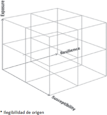 En la Figura 3, se aprecia como las categorías para analizar la vulnerabilidad ante inundaciones de Beevers et al. (2016) están insertas en un cubo que representa un grupo o población. Ahí también se puede ver que las tres categorías tienen la misma longitud, lo cual indica que todas poseen el mismo nivel de impacto en el análisis; de igual forma, es claro -por la dirección de las líneas-, que las tres áreas tienen variables de diferente orden. No obstante, hay un vértice que une a las tres líneas simbolizando con ello el enfoque de sistemas. Sus categorías y variables son: