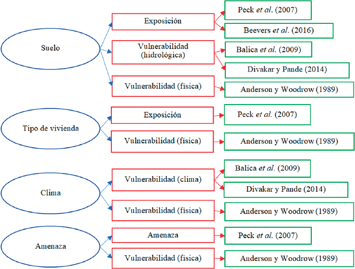 En la Figura 2 se muestran las cuatro categorías que estos autores estiman para el análisis de la vulnerabilidad: física, económica, infraestructural y social. De igual forma, se pueden ver las categorías y variables que consideran en el estudio de las amenazas y la exposición; es aquí en donde mejor se puede ejemplificar la complejidad de los estudios de vulnerabilidad ante inundaciones. En este sentido, autores como Anderson y Woodrow (1989) consideran en el análisis de la vulnerabilidad (física) variables como el suelo. No obstante, Peck et al. (2007) difieren, al considerar que el estudio de suelo contribuye al grado de exposición. De manera similar, en el estudio de Peck et al. (2007) (Figura 1) el tipo de viviendas abona al grado de exposición, lo cual no coincide con Anderson y Woodrow (1989), ya que dicha variable está incluida en el análisis de la vulnerabilidad. Estas comparaciones también nos ayudan a reconocer la cercanía que tienen las categorías que integran a la exposición, la amenaza y la vulnerabilidad.
