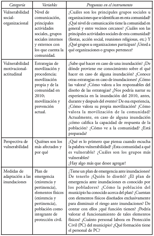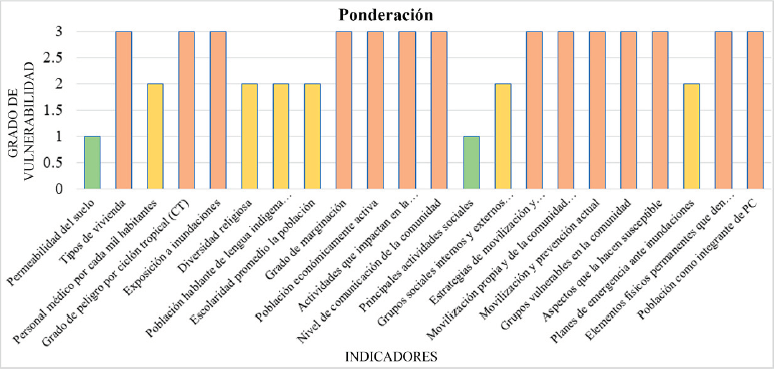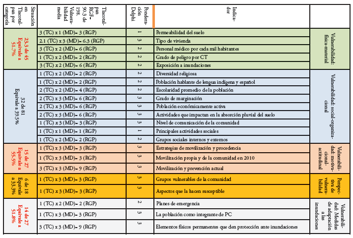 Se utilizaron cinco categorías, que se integraron, a su vez, a 22 indicadores considerados para dar cuenta de la vulnerabilidad ante inundaciones. Cada indicador fue valorado en el trabajo de campo en una escala de 1 a 3 (vulnerabilidad baja, media y alta, respectivamente); después, los mismos indicadores fueron ponderados a través del método Delphi, en una escala de 1 a 3. Con estas actividades se estableció, durante el análisis de resultados, una categorización para posicionar el resultado global.
