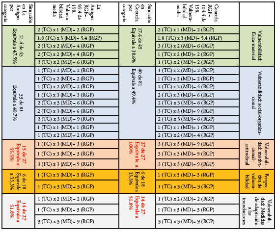Al realizar comparaciones entre los municipios se encuentran diferencias por categoría. En este sentido, en la Tabla 2, filas: 5, 7 y 9, se muestra la situación de cada categoría por municipio. En la fila 5, para Tlacotalpan la vulnerabilidad física-material, vulnerabilidad: motivacional-actitudinal y vulnerabilidad: Medidas de adaptación a las inundaciones, son las que registran mayor puntuación; en Cotaxtla, fila 7, son las categorías: Vulnerabilidad: Motivacional-actitudinal y Vulnerabilidad: Medidas de adaptación a las inundaciones, las que muestran los más altos puntajes; y en La Antigua, fila 9, es: Vulnerabilidad:Motivacional-actitudinal y Vulnerabilidad: Medidas de adaptación a las inundaciones, la que posee mayor puntuación. Dichas categorías son las que más aportan a la vulnerabilidad ante inundaciones en los municipios.