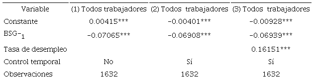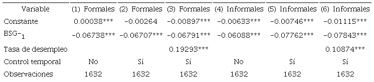 Las estimaciones, considerando la clasificación de trabajadores por condición laboral (formal e informal), no modifican significativamente la magnitud de la convergencia; el efecto más relevante está en el caso de los trabajadores formales, donde la tasa de desempleo tiene un efecto mayor sobre la disparidad de la brecha salarial que los trabajadores informales.