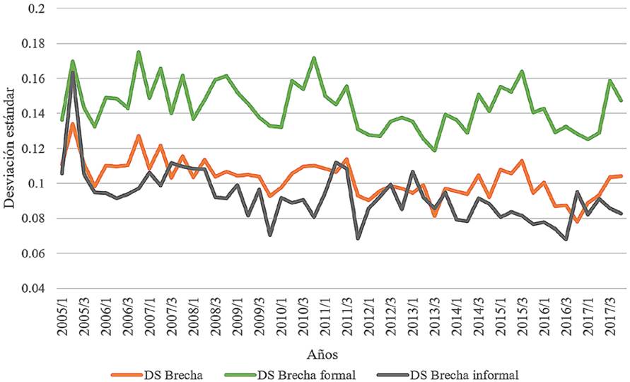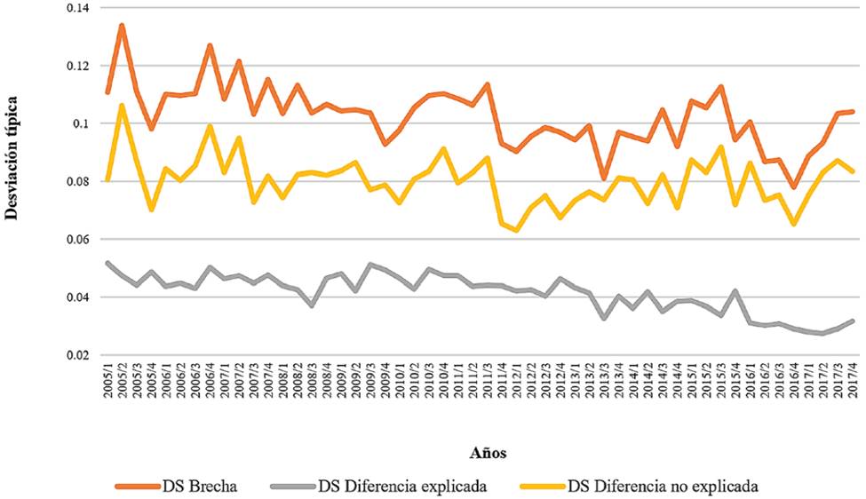 La evolución temporal de la dispersión salarial de los componentes de la brecha indican, en primer término, que ambas partes tienden a reducirse y, por tanto, contribuyen a la convergencia total; en segundo lugar, la parte explicada tiene menor dispersión y su desempeño es más estable con relación al componente no explicado y, finalmente, el comportamiento de la disparidad total está determinada por lo que sucede en los componentes no observados.