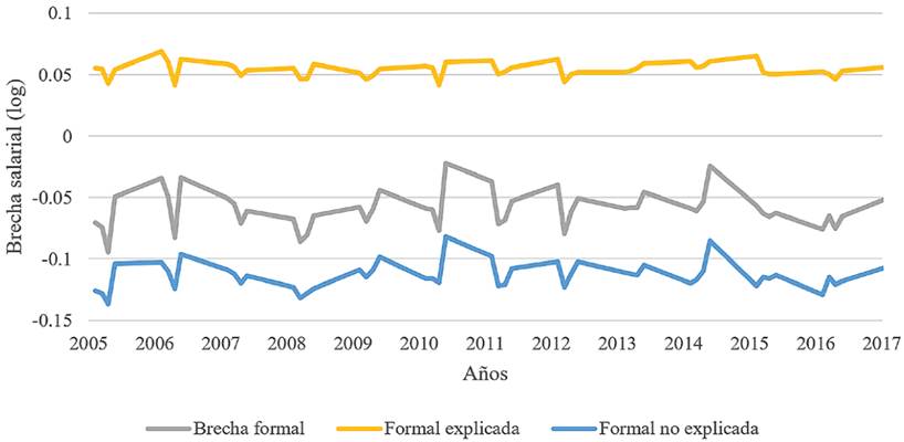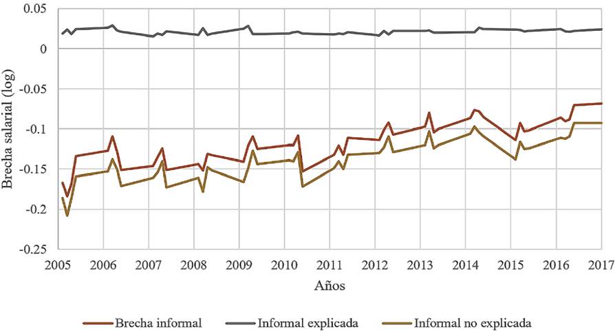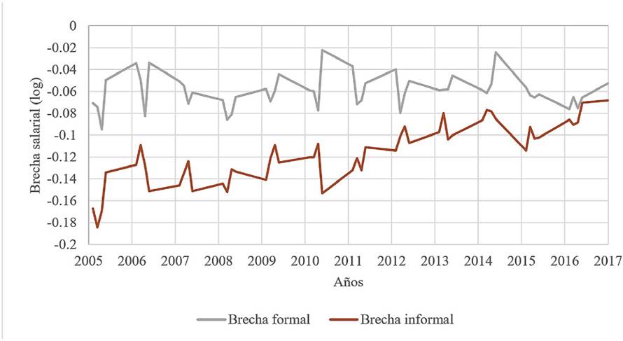 Si bien la brecha salarial general presenta un diferencial a favor de los hombres, que durante el periodo de análisis tiende a reducirse, Rodríguez, Ramos et al. (2017) señalan que este comportamiento es distinto entre trabajadores formales e informales, aspecto de suma relevancia en una economía donde el empleo informal contribuye con más de 50 por ciento.