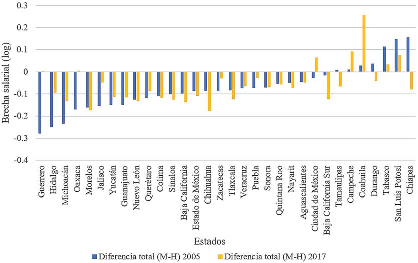 En la sección anterior se presentó la evolución de la brecha salarial nacional y su descomposición, además de considerar empleos formales e informales; no obstante, dada la heterogeneidad espacial, es pertinente identificar la magnitud de las brechas salariales por estados y las diferencias existentes entre ellos, así como su comportamiento en el lapso estudiado, aspecto que es abordado a continuación.