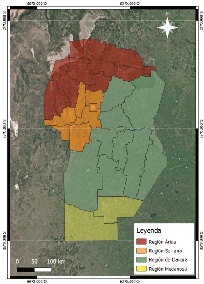 Los avances aquí desarrollados se sustentan en datos cualitativos y cuantitativos. Cualitativamente, se realiza desde una revisión de antecedentes y perspectivas teóricas, epistemológicas y técnicas en la temática mediante la sistematización y análisis de información secundaria y relevamiento de información primaria. Cuantitativamente, se utilizan datos estadísticos de organismos oficiales4 que son empleados para analizar los escenarios comunales. Para el análisis de las unidades de estudio (comunas) se considera la regionalización de la provincia de Córdoba (Mapa 1) y el relevamiento de las 168 comunas realizado por el Área Infraestructura Regional del Ministerio de Gobierno de la provincia de Córdoba (próximamente). Aunque dicha regionalización no ha sido publicada oficialmente por parte del ejecutivo, se considera oportuna su utilización debido a que toma en cuenta variables de infraestructura, servicio, equipamiento y ambiente. Esta regionalización subdivide a la provincia de Córdoba en cuatro regiones (Árida, Serrana, Llanura y Medanosa) de acuerdo con aspectos geográficos, económicos, ambientales y turísticos.