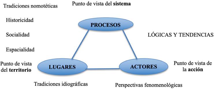 Partiendo del enriquecimiento conceptual del OT, existe una diversidad de definiciones incorporando tácitamente los conceptos de territorio y desarrollo. Considerando los diversos enfoques que versan desde perspectivas teórico-epistemológicas a otras más metodológicas, técnicas y aplicadas, es aquí donde nos detenemos para reconocer su abordaje sistémico-holístico en donde se ponen en diálogo las teorías territoriales, sociales y de la transformación en las que intervienen los lugares, procesos y actores sociales. Esta triada social6 (Figura 1) invita a repensar el territorio más allá de los lugares, como una “construcción colectiva, consciente y cambiante” (Bozzano, 2009: 224) por la manera en cómo se produce la interacción social en su interior.