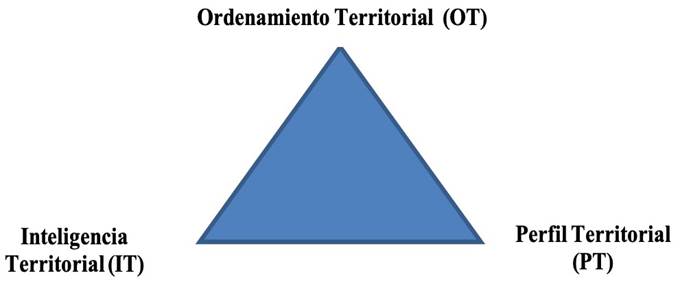 A partir y considerando los argumentos planteados por los autores, se presenta un modelo conceptual propuesto (Figura 2); modelo que, por supuesto, no agota todas las perspectivas que ofrece el objeto de estudio (OT) por lo cual puede ser aplicado a otros territorios con características divergentes e incluso, el modelo puede enriquecerse con la incorporación de otras categorías teóricas complementarias. Resume gráficamente, los niveles de jerarquía conceptual. En la cúspide se ubica el OT en función de su tradición y conceptualización teórica y epistemológica en el campo de estudio. En los vértices se sitúan las categorías de inteligencia territorial (IT) y perfil territorial (PT) con enfoques metodológicos y empíricos.