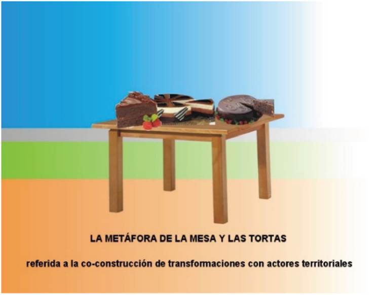 En virtud de lo anterior, cabe señalar que la IT es conceptualizada mediante la metáfora de una mesa -Figura 3-, en donde sus tres patas son referidas a los pilares de la regulación planteados por Max Weber (políticos, comunidades y empresarios) y la cuarta, refiere a los científicos y la justicia cognitiva inscriptos en el paradigma científico emergente De Sousa Santos (2009). La tabla de la mesa representa el ambiente y sus territorios, mientras que, la colocación de tortas sobre ella, simbolizan los proyectos que eligen los colectivos tanto en macro y micro proyectos. En cada pata conviven cooperación y conflicto (Santos, 2000) justicias e injusticias (social, pública, cognitiva, y empresaria), mientras que en la tabla la justicia lucha con la injusticia ambiental; el combinado es el territorio y hace referencia a la justicia territorial y a las eternas injusticias territoriales.