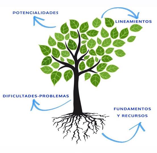 Sin embargo, existen otras perspectivas de abordaje del PT desde un enfoque multidimensional (socio-cultural, económico-productivo, político-institucional y ambiental) a partir de la identificación de variables y criterios de equidad, sostenibilidad, competitividad y gobernabilidad, que permiten comprender la realidad más allá de la arista económica, donde se articulan diversos enfoques, considerando como punto de partida el análisis del sistema territorial desde la complejidad (Muñoz Wilches, 2012; PNUD, 2014). De esta manera, abordamos el concepto de PT mediante la metáfora de un árbol (Figura 4) (Crissi Aloranti, 2019). Lo que refleja la integración de los subsistemas (ambiental, socioeconómico y político-institucional), cuyas funcionalidades y dinámicas le brindan la estructura al sistema territorial local-regional. Desde esta visión holística se identifican las potencialidades, problemas y recursos de los subsistemas mencionados, correspondientes a las comunas que conforman las regiones. La copa del árbol representa las potencialidades; el tronco los problemas y dificultades; las raíces los recursos y fundamentos, que son los que sustentan el potencial urbano-ambiental de las comunas de la región. Los lineamientos de OT y sus acciones se desprenden de las hojas, los que necesitan de una estructura para definirse y ejecutarse.