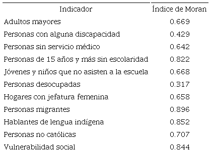No obstante, los índices más altos corresponden a las personas hablantes de lengua indígena, los migrantes y las personas de 15 años o más sin escolaridad, así como el propio índice de vulnerabilidad social calculado. Todos ellos tienen un índice de autocorrelación espacial muy alto que supera 0.8, y que en el caso particular del IVS es 0.844 (Tabla 2).