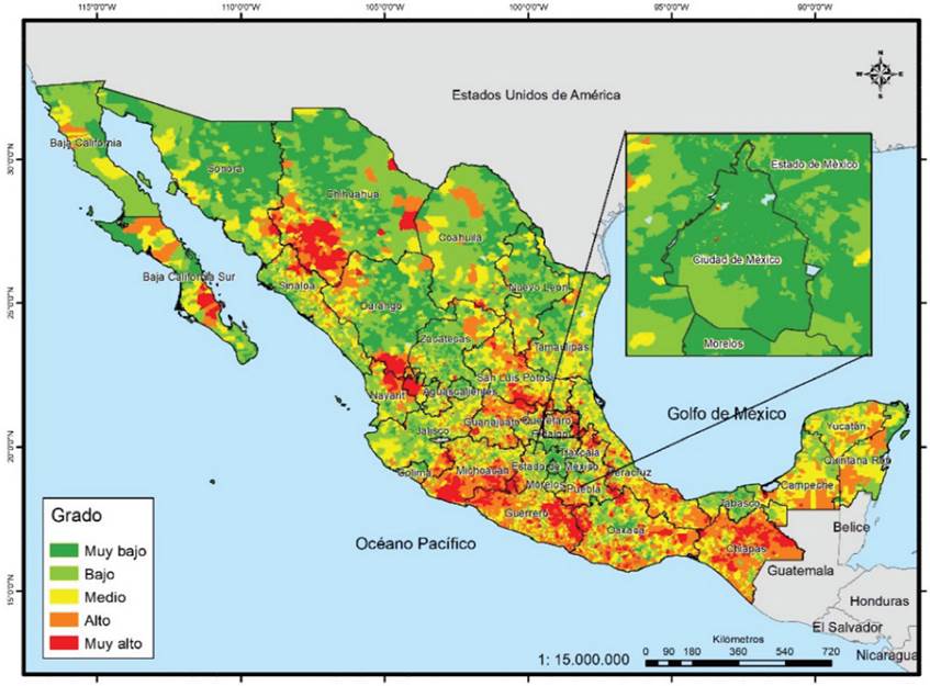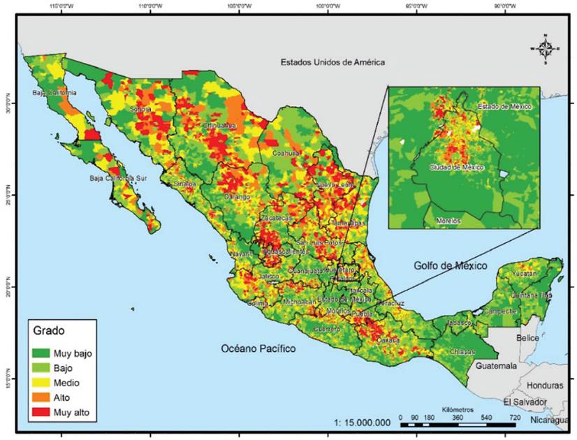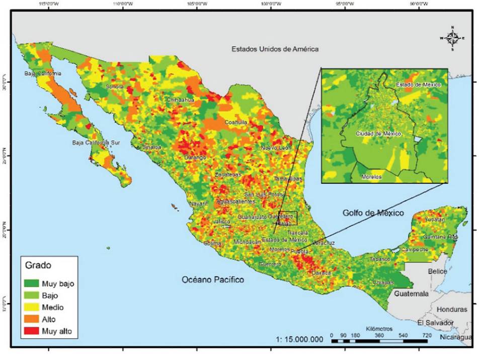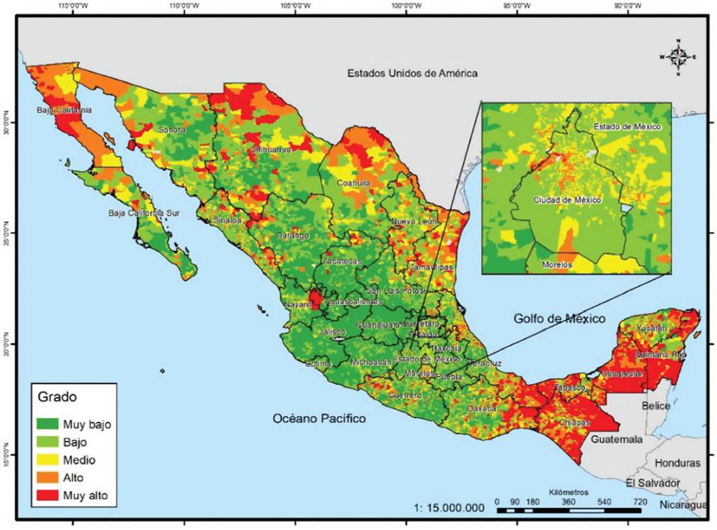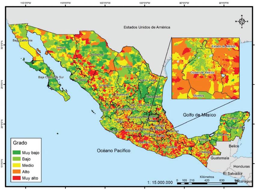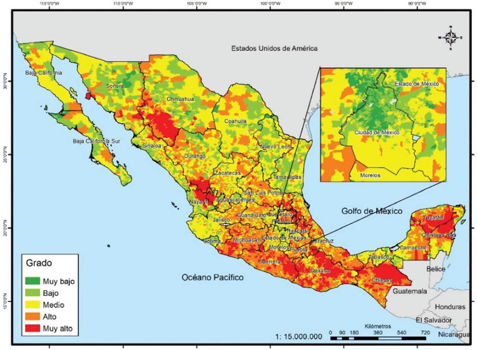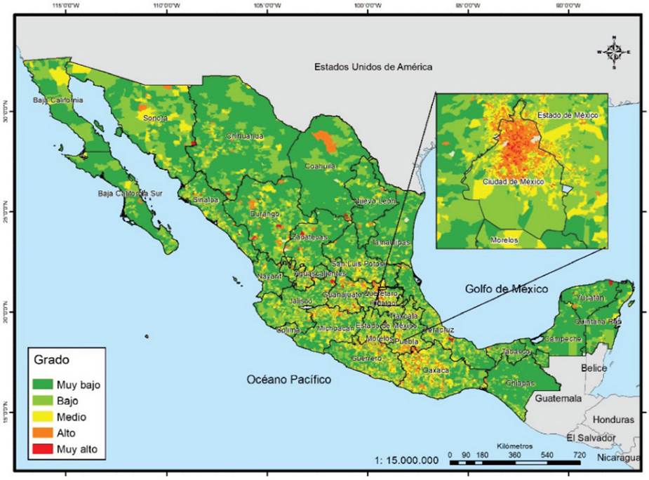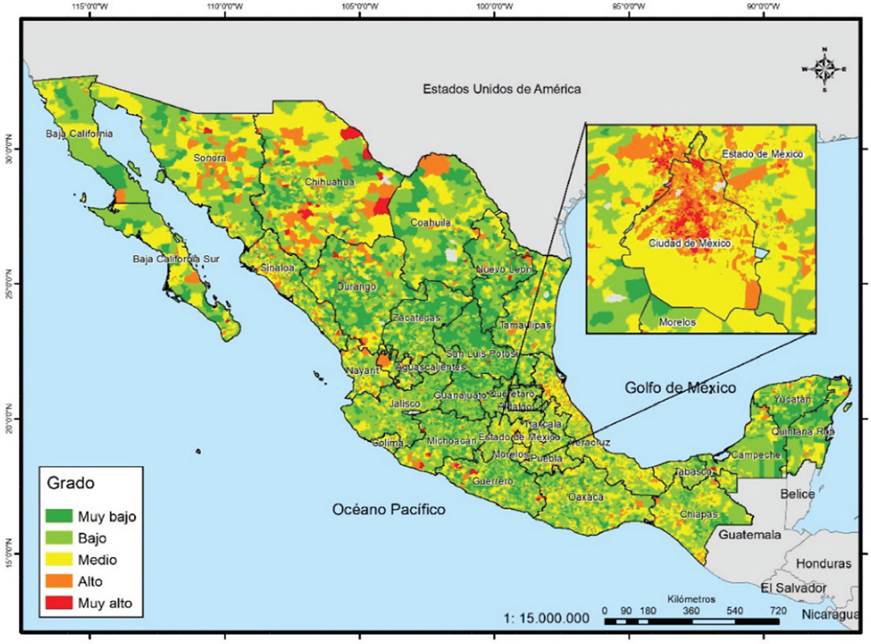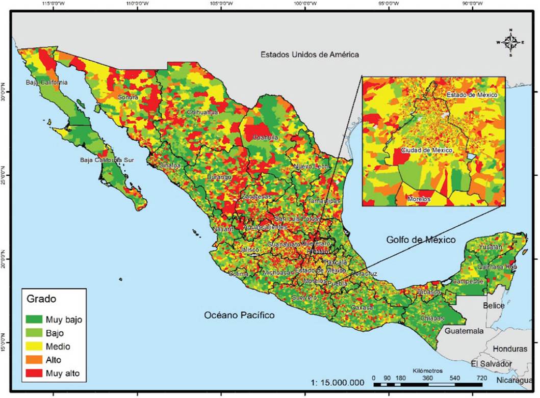 Si se tienen en cuenta los grados alto y muy alto, el ranking es semejante, pero cambia en los de menor concentración. Los de mayor proporción son Ciudad de México, Sonora, Sinaloa, Chihuahua, Baja California, Colima, Veracruz, Morelos, Aguascalientes, Yucatán y Nayarit, donde más de la tercera parte de sus secciones se encuentra en esos grados. En contraste, los estados donde menos de 15% de sus secciones presentan esta condición son Oaxaca, Michoacán, Hidalgo, Guanajuato, San Luis Potosí, Zacatecas y Guerrero. Dado que este indicador es el que presenta menor cantidad de grados muy altos, territorialmente se aprecia menos el contraste; solo en los grados altos se logra percibir zonas muy amplias en las entidades ya mencionadas en el párrafo anterior (Mapa 5).
