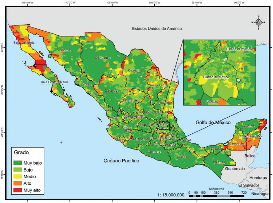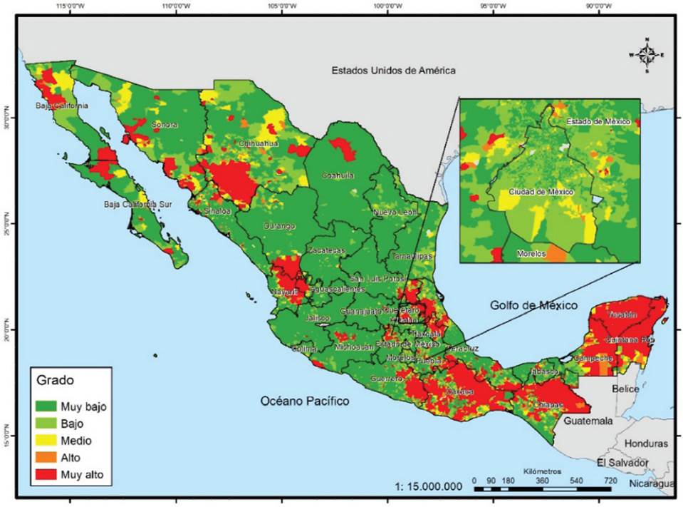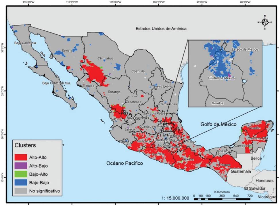 Los clústeres de alta vulnerabilidad social, es decir, áreas de una alta concentración del fenómeno y también áreas vecinas, se localizan en el noroccidente de México (en las zonas serranas): en el vértice de los estados de Nayarit, Durango y Zacatecas, así como en un corredor que incluye Michoacán, pasando por Guerrero, Guerrero Oaxaca y Chiapas. Existe, asimismo, otro corredor que se junta con el anterior, que cruza a San Luis Potosí, Veracruz, Puebla y Tlaxcala; por último, hay un gran clúster de valores altos en la Península de Yucatán y por el contrario, los de valores bajos de vulnerabilidad se concentran en zonas urbanas del norte y centro de México y, como era de esperarse, en la Ciudad de México (Mapa 12).