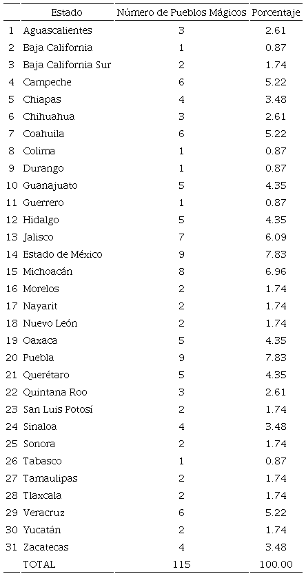 De esta forma, una vez que la localidad está incorporada a Pueblos Mágicos, debe obtener la renovación cada año y cumplir con los criterios de certificación del programa para mantener su nombramiento. Ya dentro del programa, las autoridades estatales y municipales que hayan solicitado la incorporación comprometen una aportación económica de cuando menos tres años para la realización de las acciones, proyectos y programas de trabajo que se encarguen del beneficio comunidad-autoridad. La distribución actual de los Pueblos Mágicos puede observarse a continuación (Cuadro 1):
