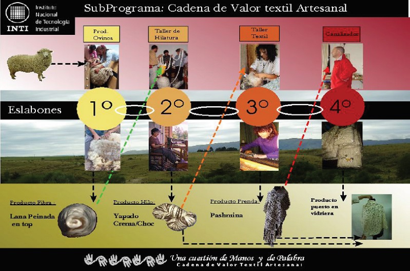 En segundo lugar, estudiamos el programa Cadena de Valor Textil Artesanal, que surgió junto con los cambios ocurridos en Argentina desde 2003 a 2015, periodo en que se desarrollan políticas y programas de Estado con la finalidad de resolver la urgencia de la pobreza y el desempleo masivo heredado de la etapa neoliberal de los años noventa. De esta forma, el INTI2 desarrolló, a través de una de sus agencias de extensión (la Unidad regional INTI de Capilla del Monte-Córdoba), un programa de reformulación socioproductiva por medio de la implementación de una cadena de valor en el ámbito textil, que comenzaba con el producto primario de la lana, pasaba por la hilatura, el tejido y terminaba en la comercialización del producto final. Es de destacar que entre todos los componentes de la cadena se intentó establecer una relación productiva de tipo solidaria. Tal experiencia, aludida por los técnicos del INTI como una “fábrica a cielo abierto”, buscó la complementariedad económica y social de los distintos eslabones de la cadena, para enfrentar su debilidad como productoras aisladas y convertirlas en una comunidad productiva.