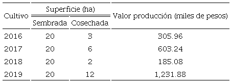 SIAP (Servicio de Información Agropecuaria y Pesquera) (2016-2019), “Anuario Estadístico de la Producción Agrícola, Ciclos perennes, riego + temporal”, Ciudad de México, SIAP, <https://acortar.link/QpvxFX>, 20 de mayo de 2020.