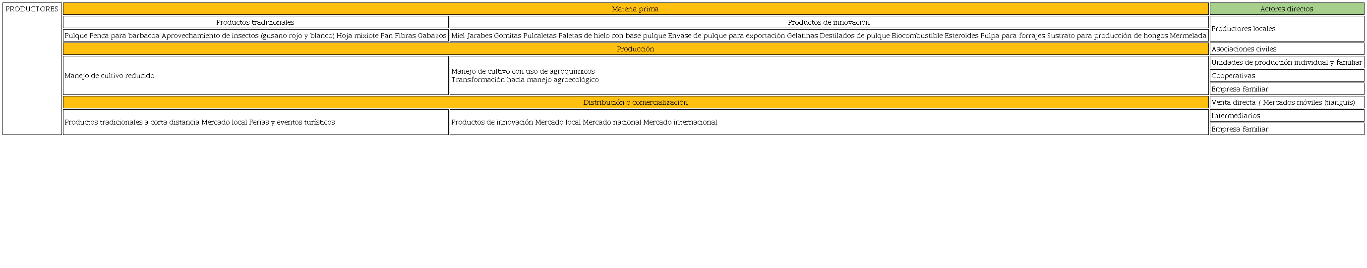 2. La otra línea de seguimiento fue a partir de las dificultades productivas -tanto agropecuarias como de conservación, distribución y comercialización del maguey y sus derivados- para encontrar una cadena similar a la que se sigue para la producción alimentaria. Estas condiciones se afrontaron en conjunto con los productores que trabajan de manera colectiva en asociaciones civiles para preservar y comercializar maguey. Por esa razón, se discriminó trabajar con todos los productores que siguen una línea de producción individual, aunque en la mayor parte de ella también interviene la familia. El trabajo específico con las asociaciones de productores radica en las motivaciones que las llevan a unirse en colectivos, porque, desde su punto de vista, son éstos los que plantean demandas y realizan acciones para señalar injusticias y exigir derechos. De acuerdo con los derivados del maguey, se enlistó el número de productos y lugares donde se hace la primera entrega; esto sirvió para estimar distancia de recorridos en la distribución; por otro lado, los servicios en el área dieron el criterio para establecer un circuito corto o largo, en tanto es una población de área urbana, periurbana o rural.