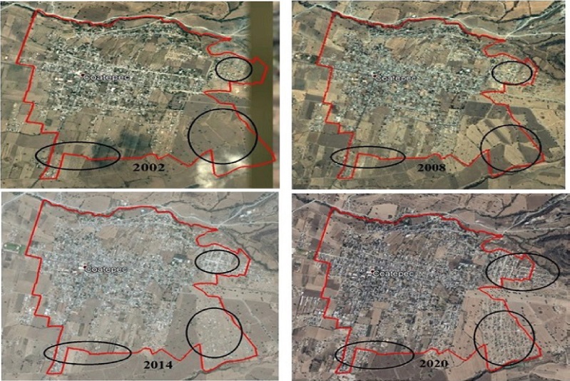 En Coatepec se incrementó la vivienda irregular hacia 1996, como consecuencia del auge del mercado inmobiliario en todo el municipio de Ixtapaluca; impactó directamente en la tasa de crecimiento demográfico (Ayuntamiento de Ixtapaluca, 2019), repercutió en las transformaciones paisajísticas y del uso del suelo. En la Figura 2 puede observarse la expansión de la vivienda, que muestra una transformación de 18 años, fruto de la dinámica demográfica que acarreó cambios en la estructura del pueblo.