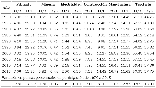 En congruencia con las tendencias globales, entre 1970 y 2015, el sector primario en México redujo sistemáticamente su contribución a la producción y al empleo totales, mientras que el sector terciario la incrementó progresivamente (Cuadro 1).