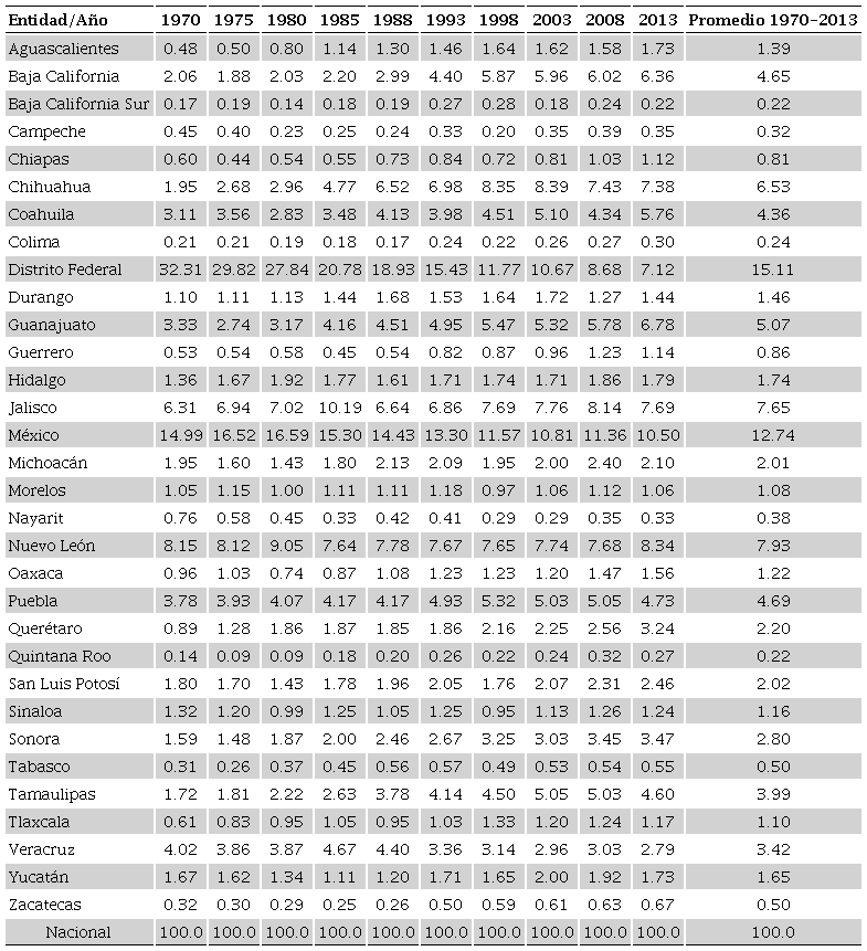 En los años setenta se acentuó la concentración de la manufactura en las zonas metropolitanas del Distrito Federal,6 Guadalajara y Monterrey; con el fin de alentar la descentralización de las empresas se ofrecieron atractivas condiciones para su reubicación y apoyos a las nuevas inversiones a través de un sistema diferenciado que beneficiaba a las ciudades medias que se deseaban promover; también se constituyeron fideicomisos para empresas manufactureras llamadas “tractoras,” por considerarse que eran las que estructuraban las cadenas productivas, desarrollaban proveedores más eficientes y eran el ancla del crecimiento regional y de los agrupamientos industriales (Maldonado Carrasco, 2009). Los efectos de esta política de financiamiento fueron contraproducentes al estimular la concentración intrarregional y no a favor de reducir las desigualdades interregionales.