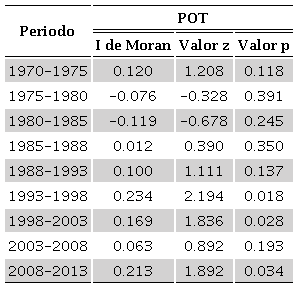 Con la estimación del estadístico I de Moran estimado de manera local y univariada se halló evidencia de autocorrelación espacial para la variable POT, aunque los resultados indican que sólo los periodos intercensales más recientes fueron estadísticamente significativos (Cuadro 3). La dependencia espacial identificada a partir de 1993 puede explicarse por dos razones que favorecieron a la actividad manufacturera: la firma del Tratado de Libre Comercio de América del Norte, en 1992, y la modificación de la Ley de Inversión Extranjera Directa, en 1993.