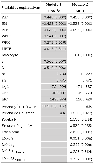 La ventaja de GNS se basa en que cuantifica la dependencia espacial13 mediante la observación de las interacciones exógenas, endógenas y entre los términos de error; también es posible medir los efectos directos e indirectos, así como los de retroalimentación.