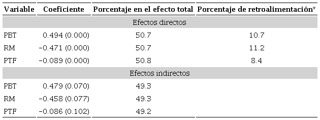 Al evaluar los efectos directos se corroboraron como válidas las hipótesis planteadas en esta investigación: PBT resultó ser el principal determinante del empleo con efectos positivos, en tanto que RM y PTF tienen efectos negativos pero diferenciados, en virtud de que las remuneraciones reales restringen mayormente el crecimiento del empleo.