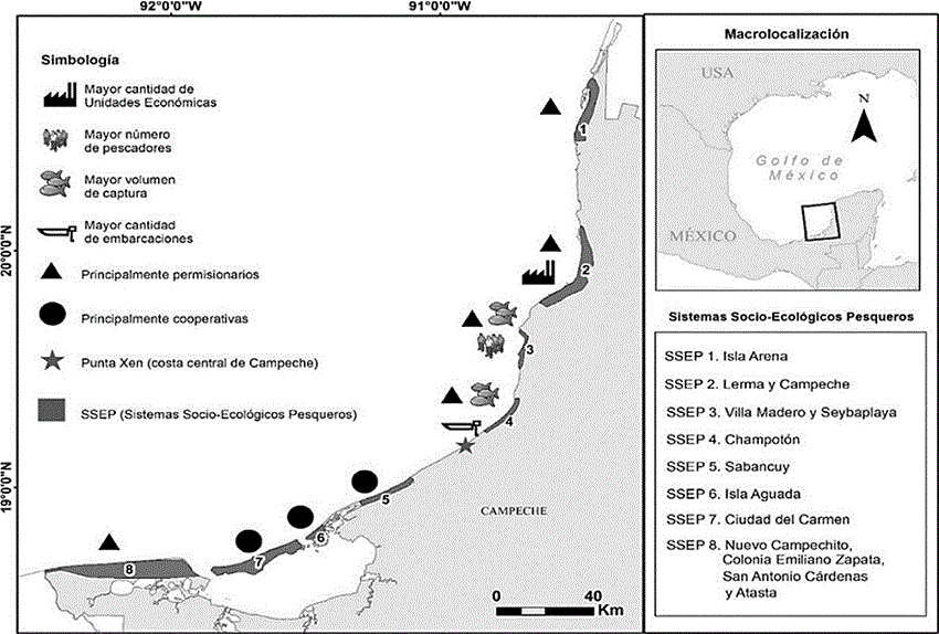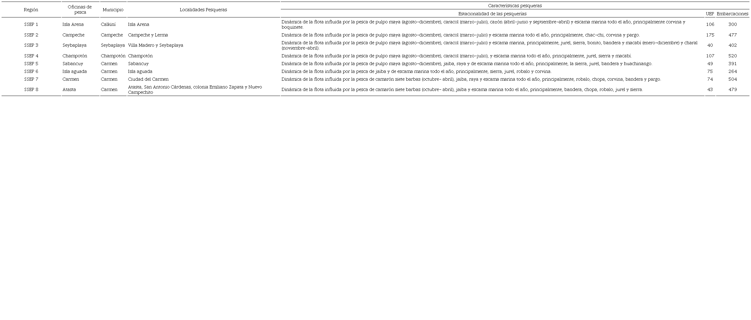 La estacionalidad legal del esfuerzo pesquero se identificó por los periodos de veda de las pesquerías de Campeche indicados en el Anuario Estadístico de Acuacultura y Pesca 2014 (Sagarpa y Conapesca, 2014a) y en el cuadro de vedas (Sagarpa y Conapesca, 2014b). El número de las Unidades Económicas Pesqueras (UEP), que incluye cooperativas, permisionarios, asociaciones pesqueras (frentes, uniones o federaciones) y de otro tipo de organización (por ejemplo, bodegas, navieras, etc.), se obtuvo del Directorio Estadístico Nacional de Unidades Económicas (DENUE) (Inegi, 2018). Las UEP se clasifican en micro o pequeño dependiendo del número de personas registradas, con 10 o menos personas o con 11-100 personas, respectivamente. El número de pescadores y de embarcaciones se obtuvo del Ordenamiento pesquero ribereño marino (Botello Ruvalcaba et al., 2010).