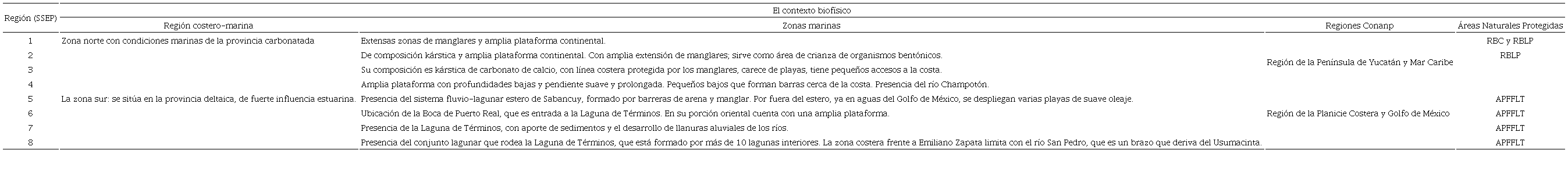Se identificaron ocho regiones SSEP en el estado de Campeche (Mapa 2). Cuatro regiones en la zona norte y cuatro regiones en la zona sur, que se distinguieron entre sí por sus características biofísicas, recursos pesqueros más importantes y el tipo de UEP.