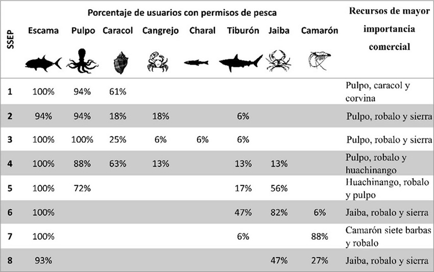 Todos los informantes clave tienen permisos de pesca de escama marina, y la mayoría, de pulpo (94%) y de caracol (61%) (Figura 2). El SSEP 1 posee 106 Unidades Económicas Pesqueras (UEP). Esas UEP no están organizadas en frentes o uniones de pescadores, y 89.6% se clasifican en micro. La mayoría son permisionarios (n = 96), y 10 son cooperativas. Este SSEP tiene registrados 384 pescadores y 300 embarcaciones (Tabla 1). La zona costera en donde se ubica este SSEP 1 tiene influencia de las Reservas de la Biosfera RBC y RBP, ambas consideradas como hábitat crítico de los recursos pesqueros costeros por sus amplias zonas de manglares (Tabla 2).