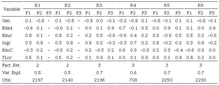 En el Cuadro 5 se presentan los pesos de cada variable después de realizar el análisis de factores componentes principales con rotación varimax para los datos de cada región. Se retuvieron dos factores en R1 y R2, y tres factores en el resto de las regiones. Se observa que es posible agrupar las variables en factores componentes principales, aunque estas agrupaciones varían según la región. Por ejemplo, al considerar sólo las variables con pesos mayores a 0.5, edad y educación aparecen juntas en el mismo factor en todas las regiones; sin embargo, a ellas se puede asociar el tamaño de la localidad en R1, el estado civil en R4, ambas en R2, o ninguna variable adicional en R3, R5 y R6.